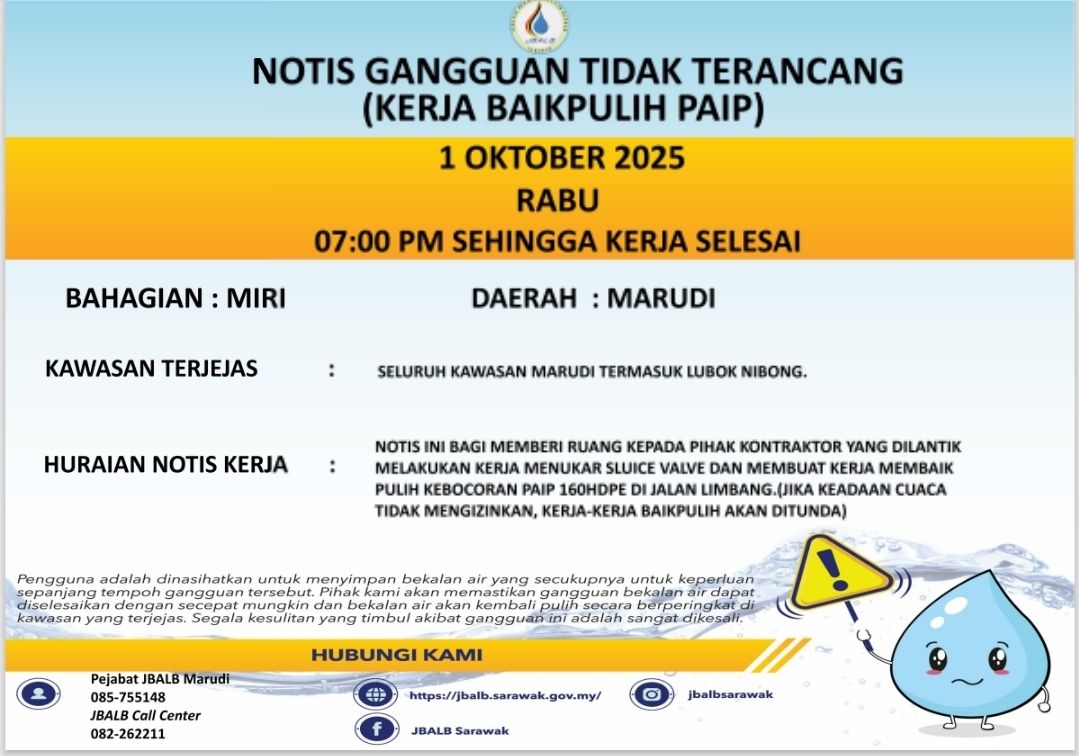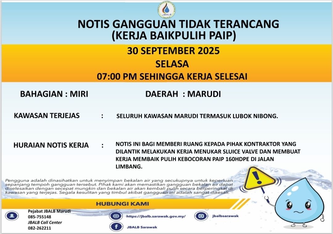 Unscheduled Water Interruption Notice at Miri (Marudi) (30.09.2025)