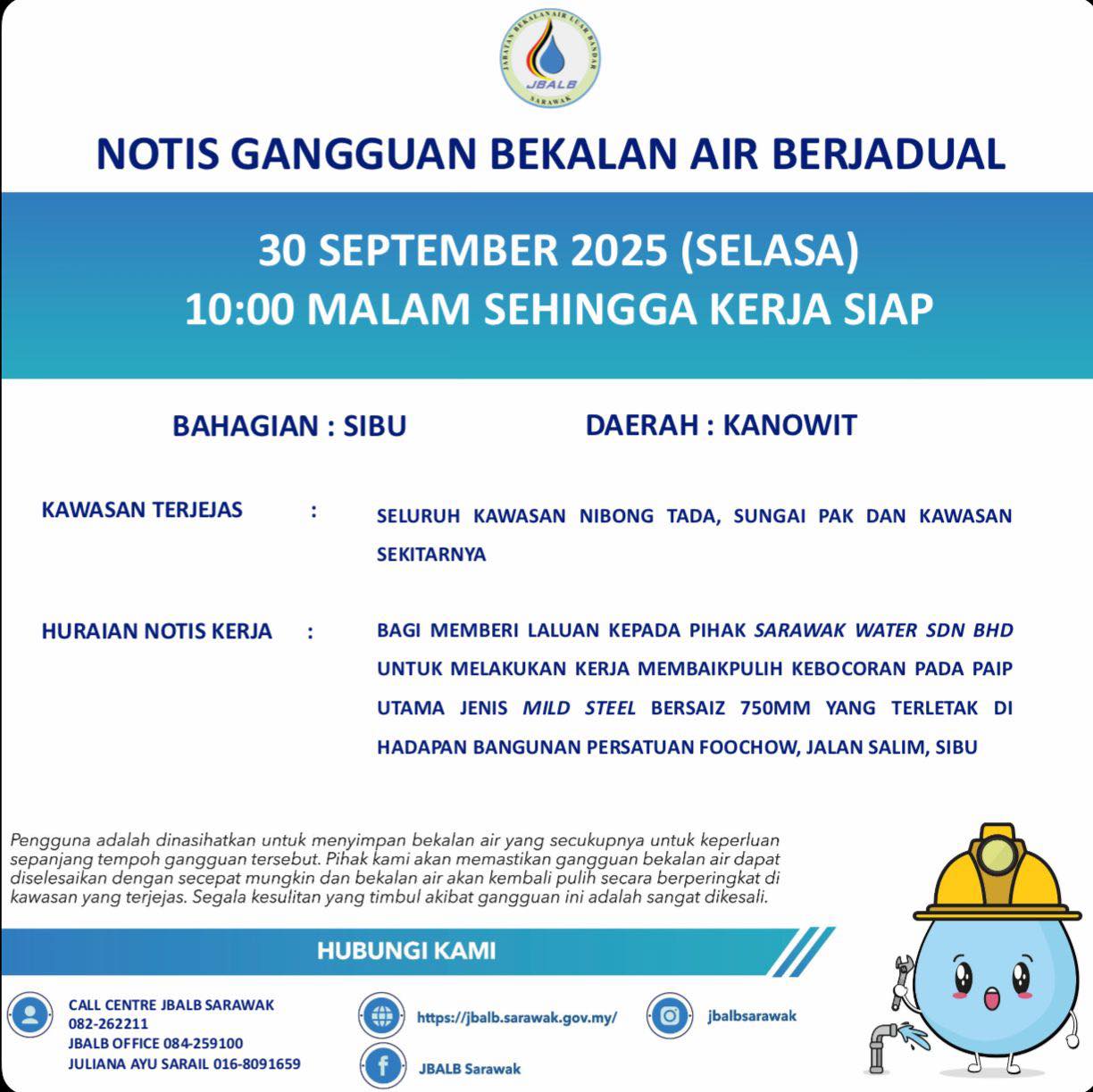 Scheduled Water Interruption Notice at Sibu (Kanowit) (30.09.2025)