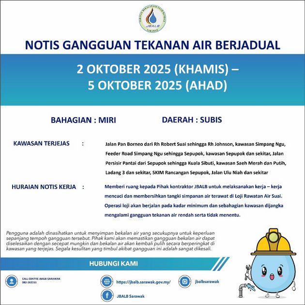 Scheduled Water Interruption Notice at Miri (Subis) (02-05.10.2025)