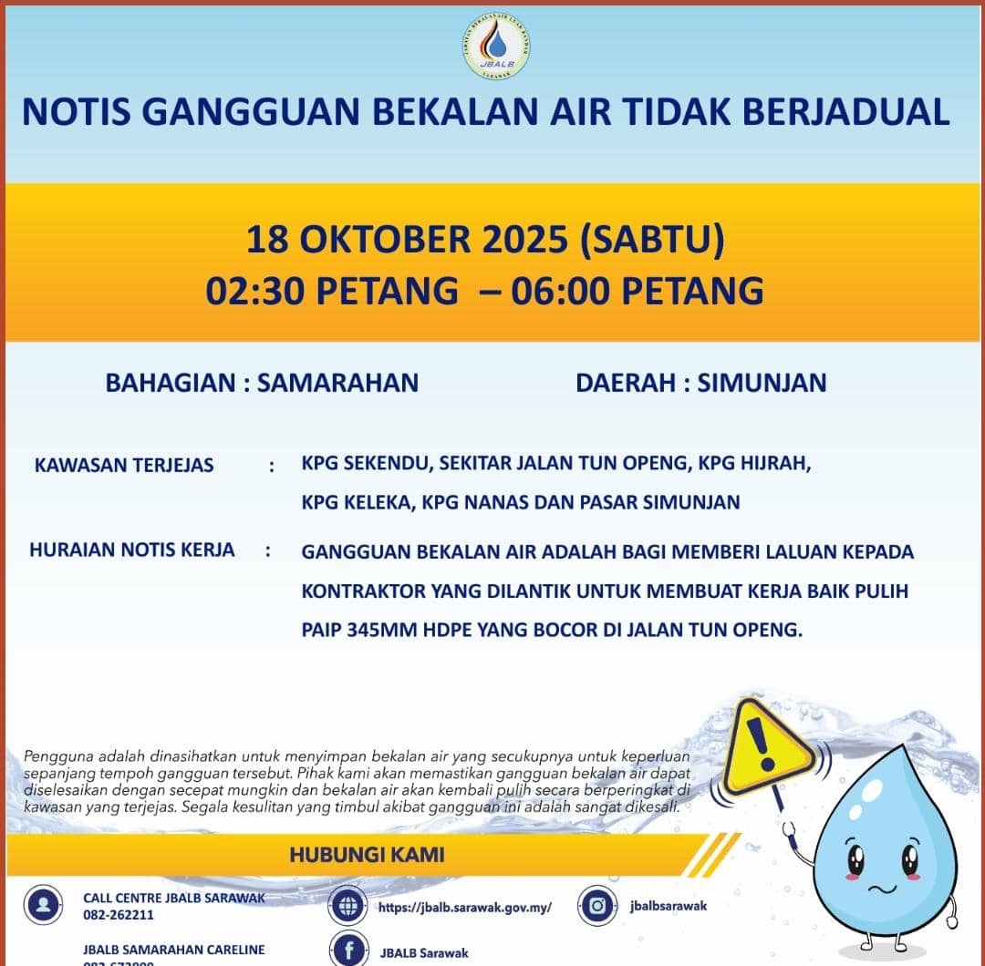 Unscheduled Water Interruption Notice at Samarahan (Simunjan) (18.10.2025)
