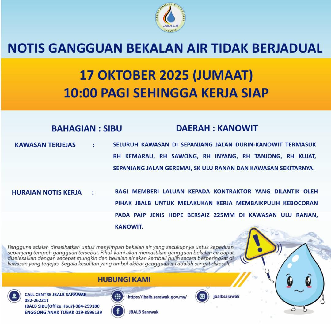 Unscheduled Water Interruption Notice at Sibu (Kanowit) (16.10.2025)
