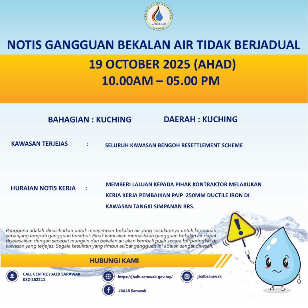Unscheduled Water Interruption Notice at Kuching (Bengoh) (19.10.2025)