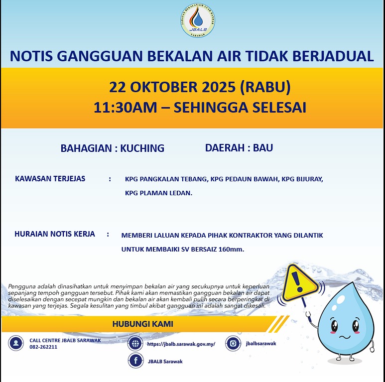 Unscheduled Water Interruption Notice at Kuching (Bau) (22.10.2025)