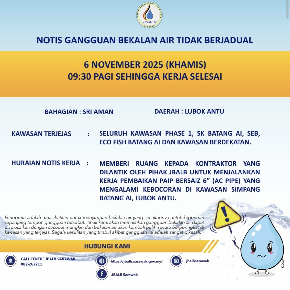 Unscheduled Water Interruption Notice at Sri Aman (Lubok Antu) (06.11.2025)