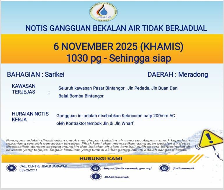 Unscheduled Water Interruption Notice at Sarikei (Meradong) (06.11.2025)