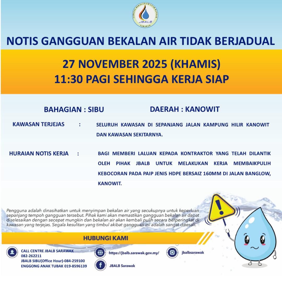 Unscheduled Water Interruption Notice at Sibu (Kanowit) (27.11.2025)