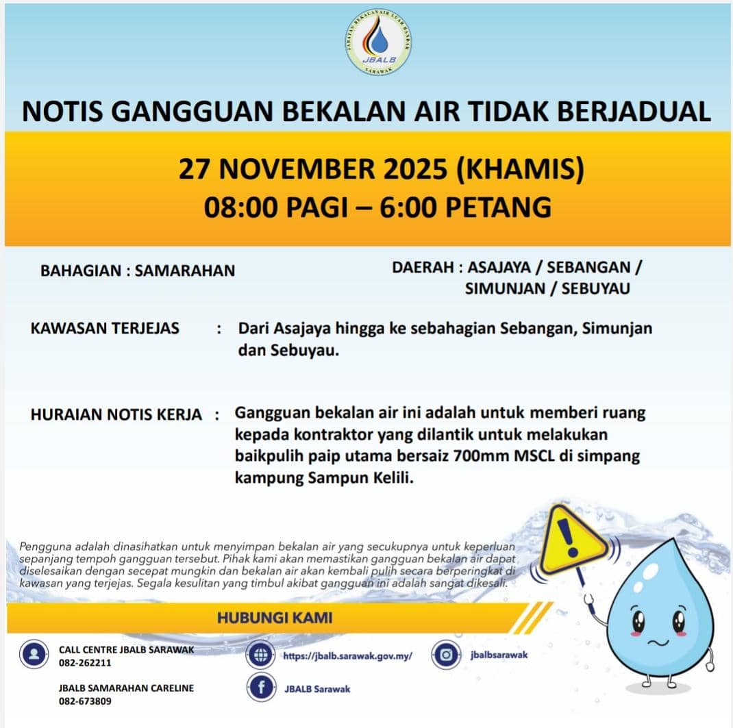 Unscheduled Water Interruption Notice at Samarahan (Asajaya/Sebangan/Simunjan/Sebuyau) (27.11.2025)