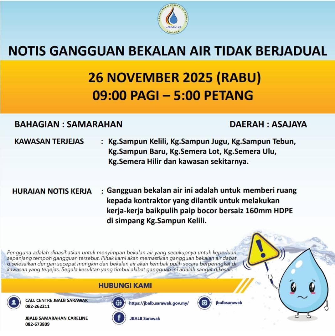 Unscheduled Water Interruption Notice at Samarahan (Asajaya) (26.11.2025)