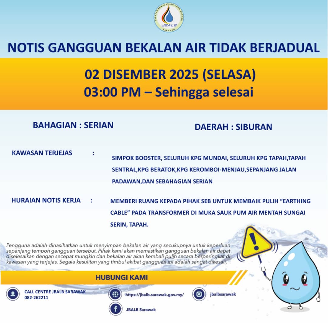 Unscheduled Water Interruption Notice at Serian (Siburan) (02.12.2025)