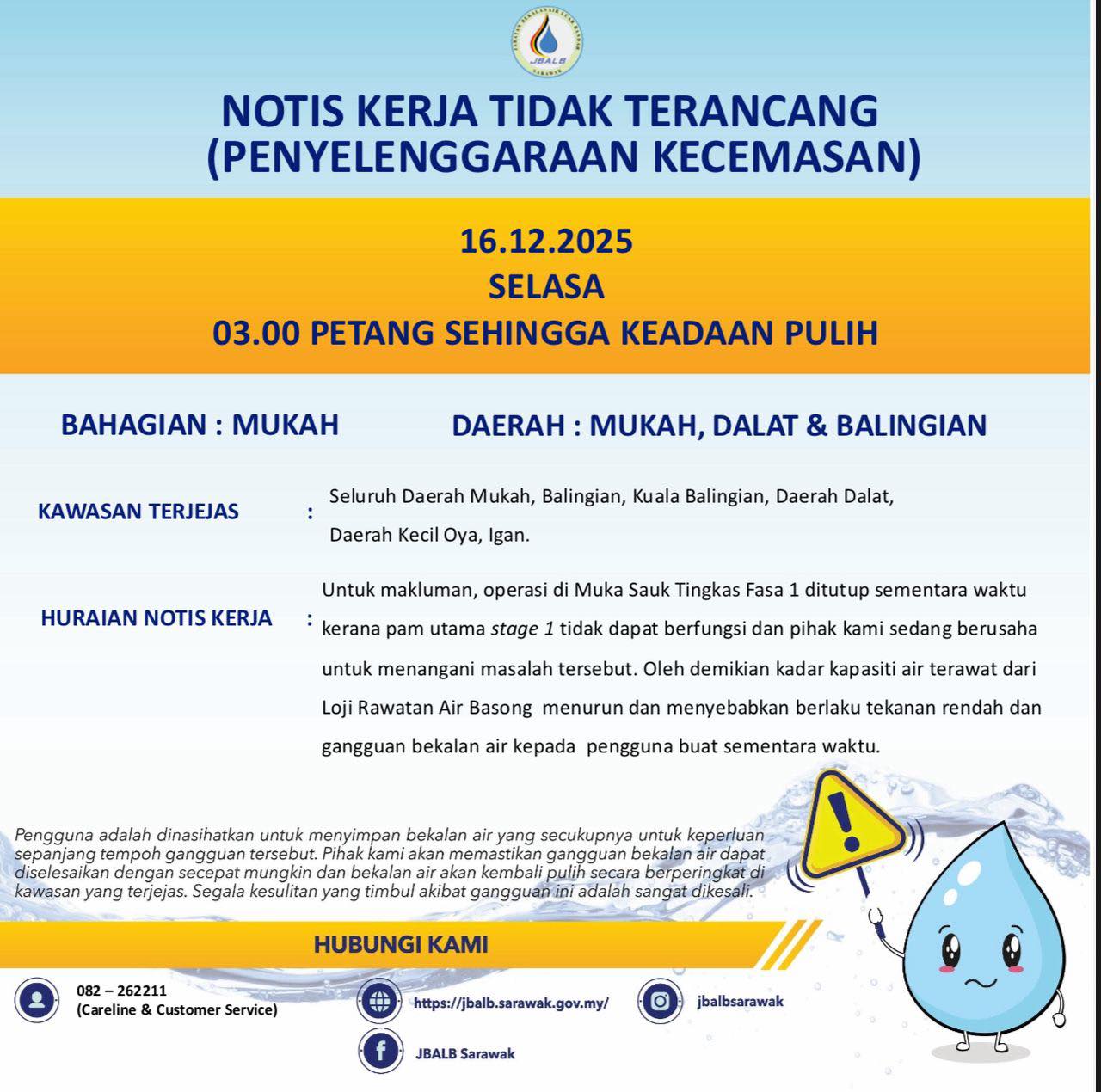 Unscheduled Water Interruption Notice at Mukah (Dalat, Balingian) (16.12.2025)