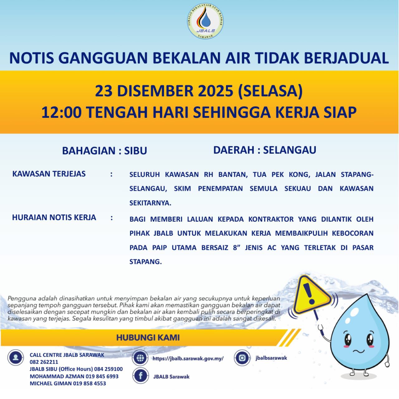 Unscheduled Water Interruption Notice at Sibu (Selangau) (23.12.2025)