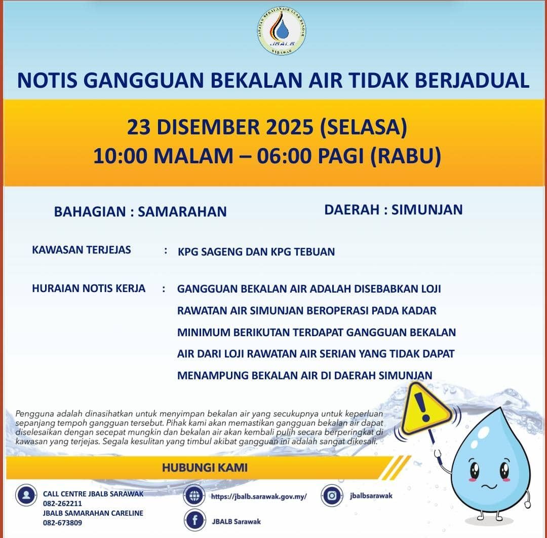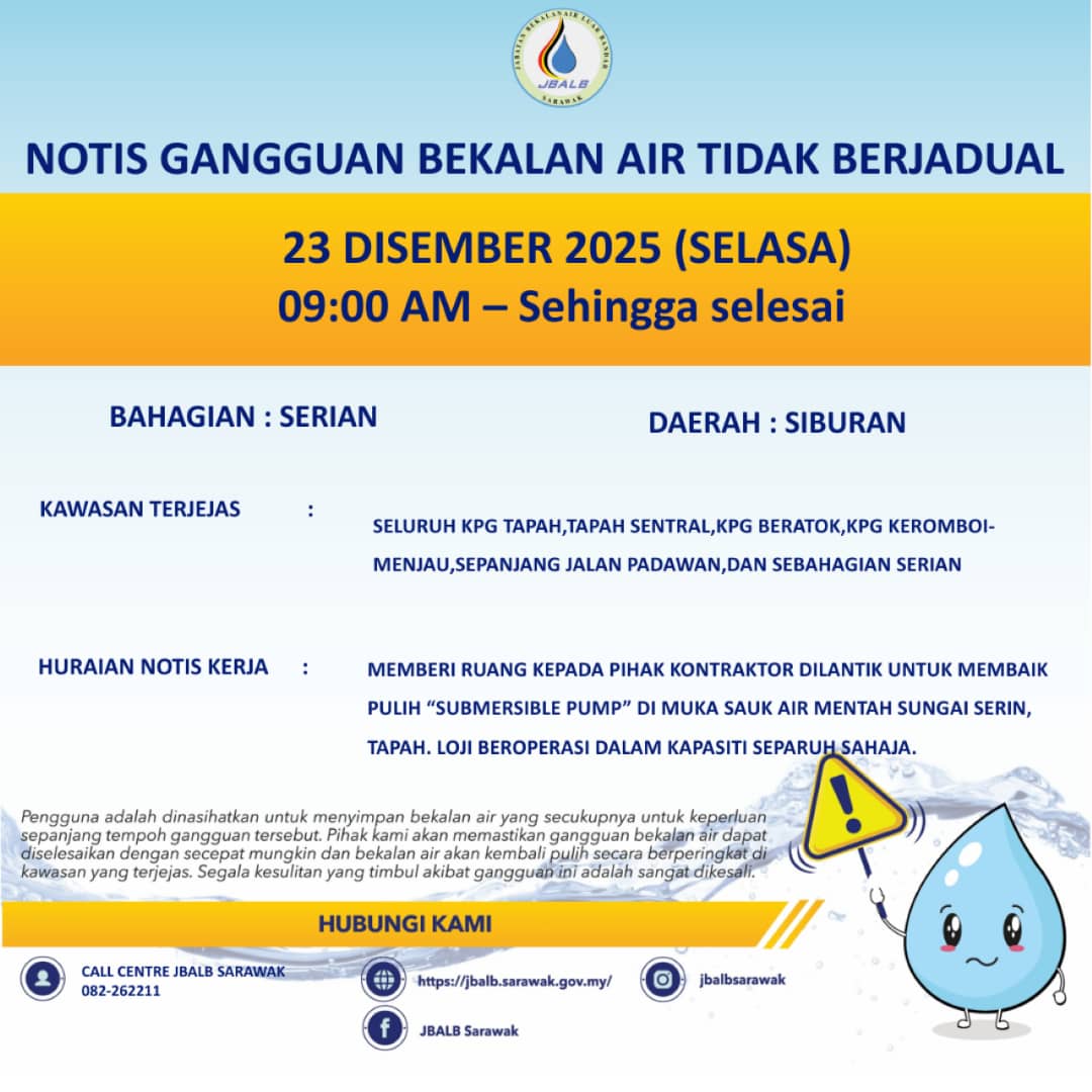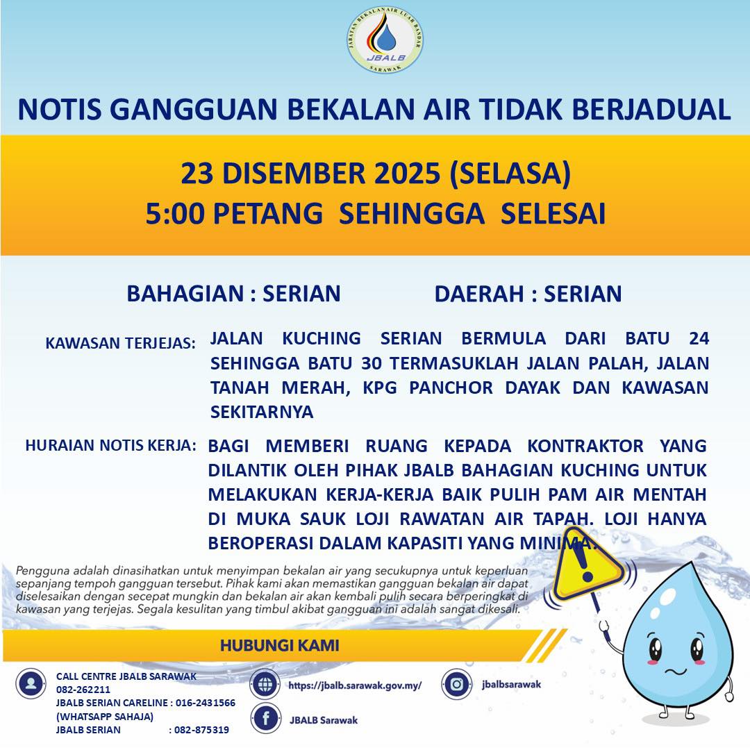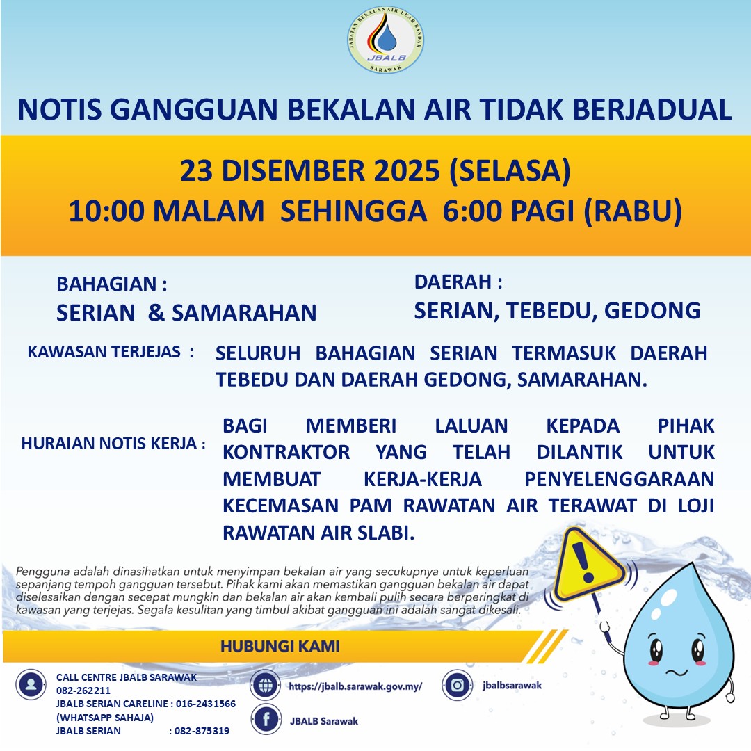 Unscheduled Water Interruption Notice at Serian & Samarahan (Serian,Tedebu,Gedong) (23.12.2025)