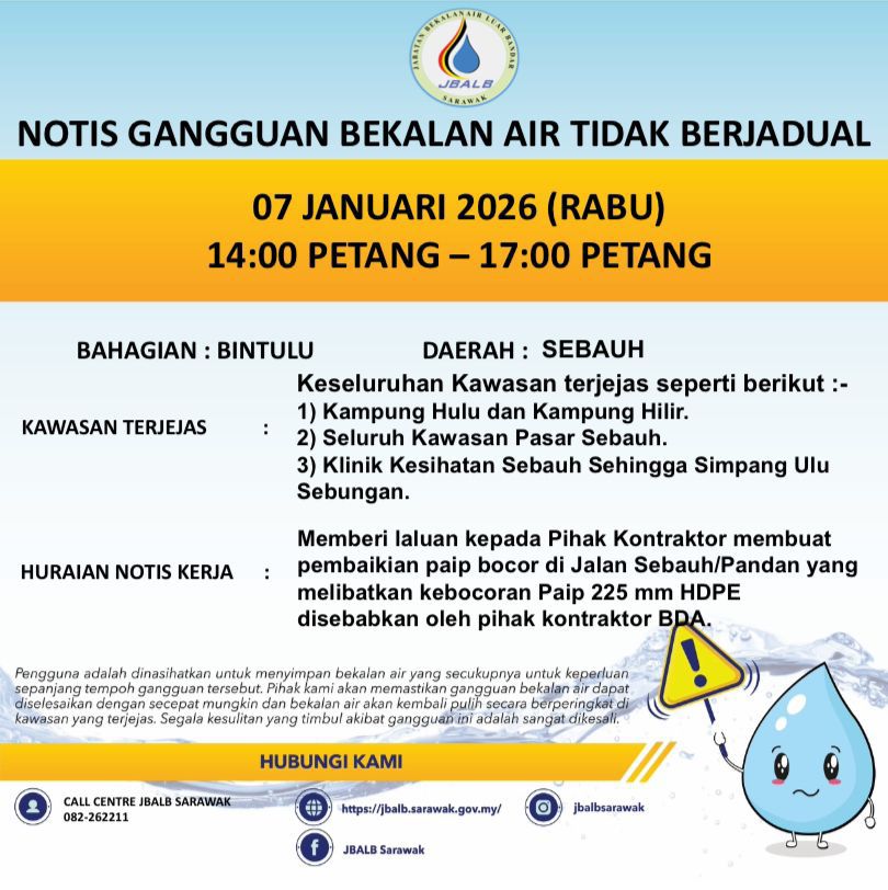 Unscheduled Water Interruption Notice at Bintulu (Sebauh) (07.01.2026)