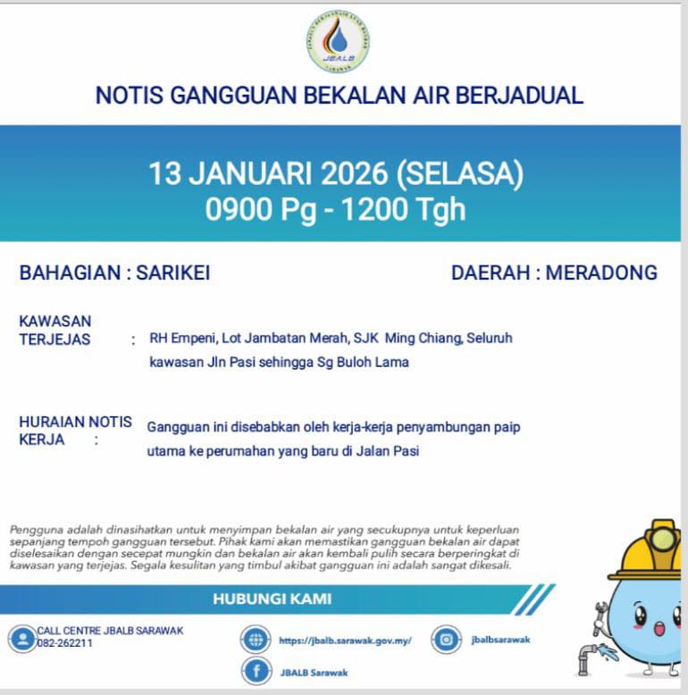 Scheduled Water Interruption Notice at Sarikei (Meradong) (13.01.2026)