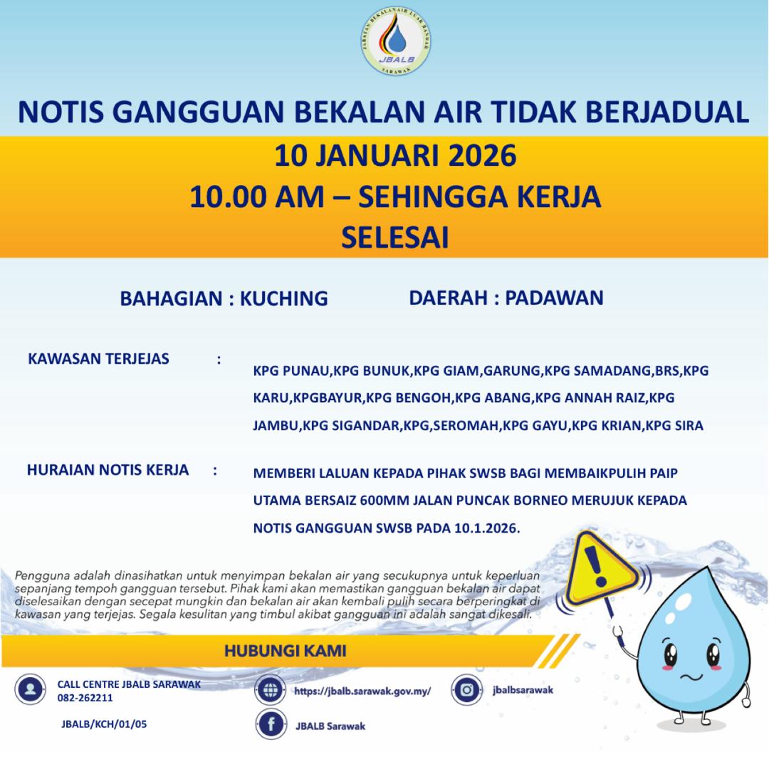 Unscheduled Water Interruption Notice at Kuching (Padawan) (10.01.2026)