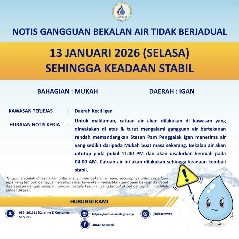 Unscheduled Water Interruption Notice at Mukah (Igan) (13.01.2026)