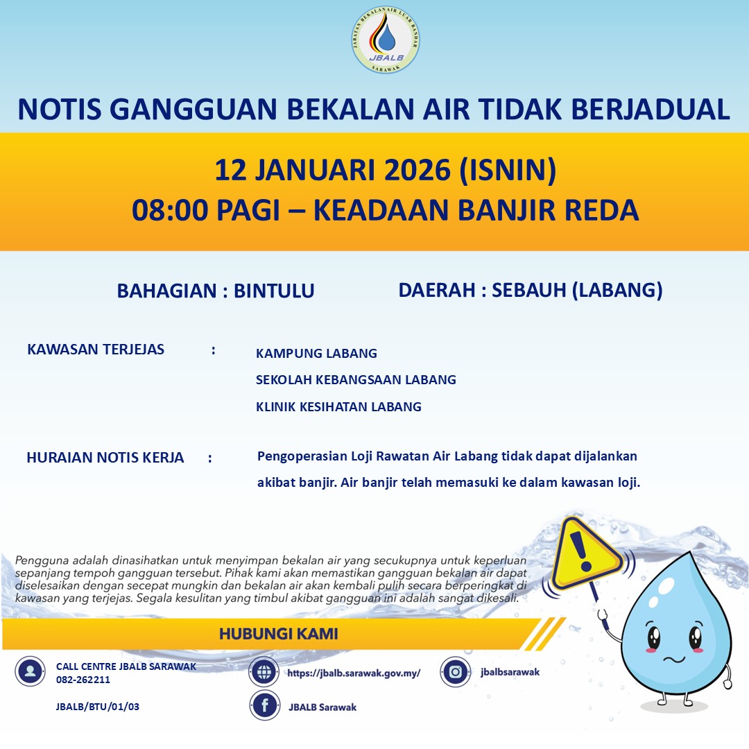Unscheduled Water Interruption Notice at Bintulu (Sebauh - Labang) (12.01.2026)