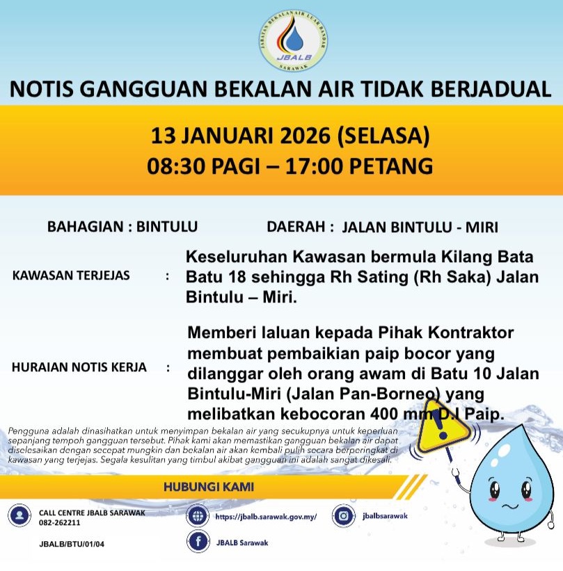Unscheduled Water Interruption Notice at Bintulu (Jalan Bintulu-Miri) (13.01.2026)