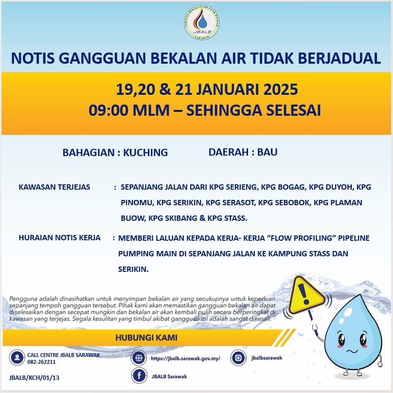 Unscheduled Water Interruption Notice at Kuching (Bau) (19,20,21.01.2025)