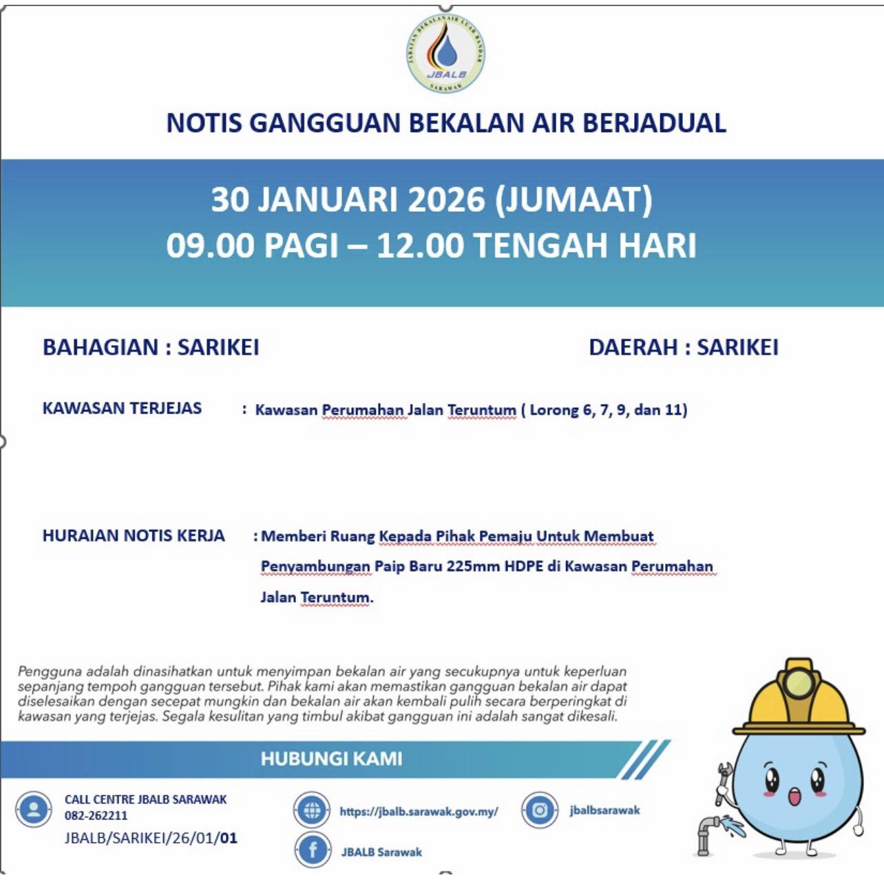 Scheduled Water Interruption Notice at Sarikei (30.01.2026)