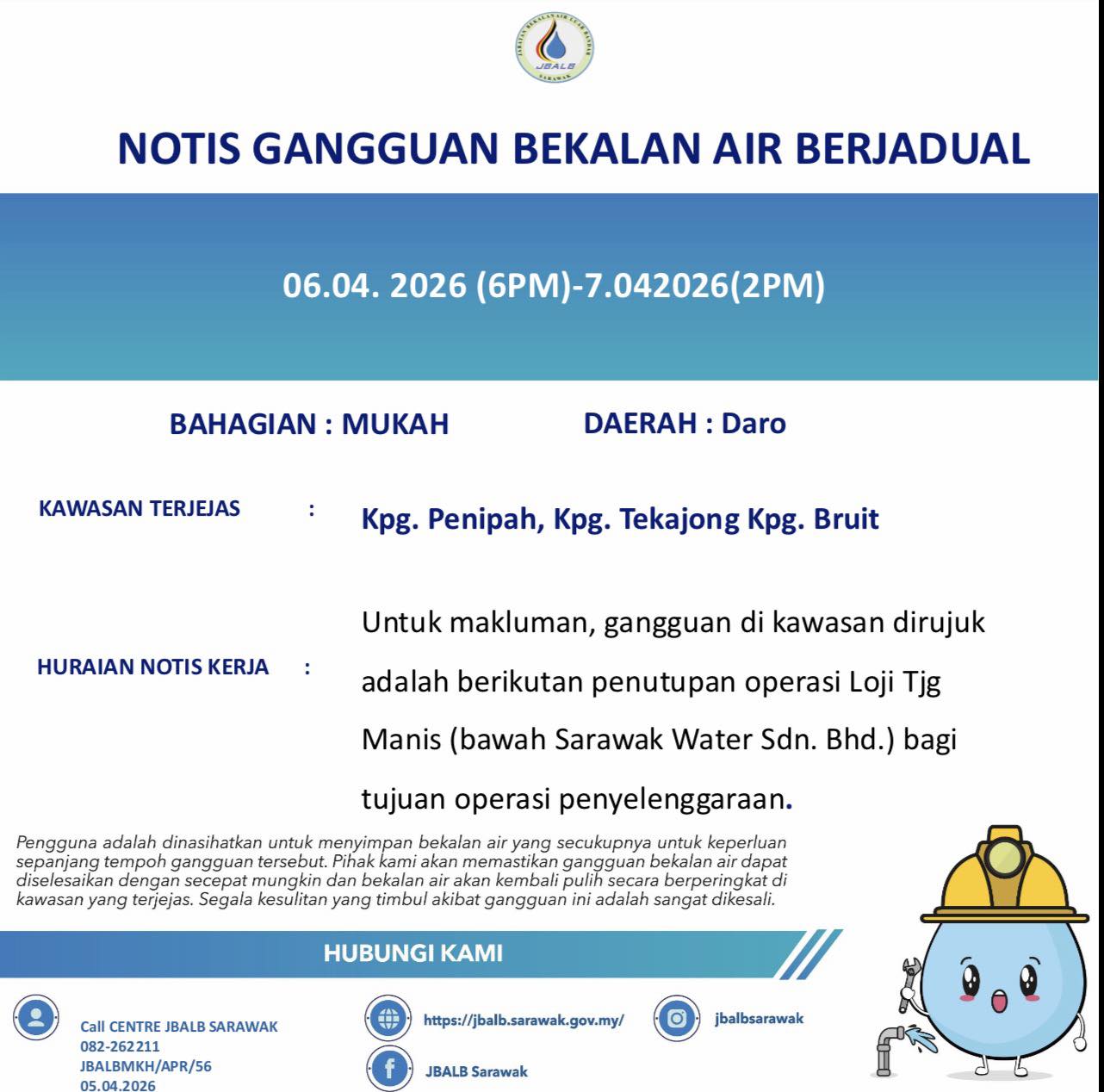 Scheduled Water Interruption Notice at Mukah (Daro) (06-07.04.2026)