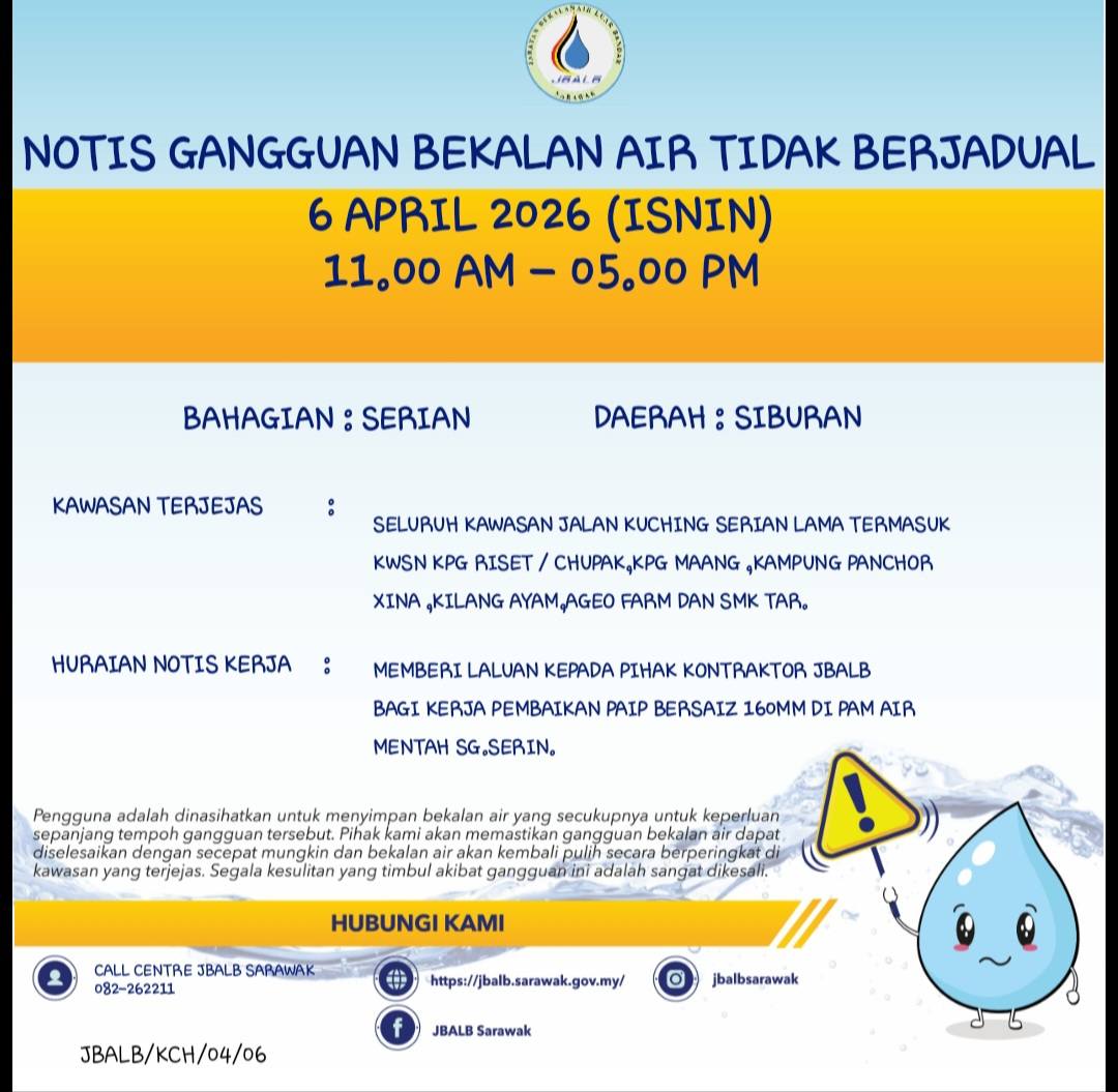Unscheduled Water Interruption Notice at Serian (Siburan) (06.04.2026)