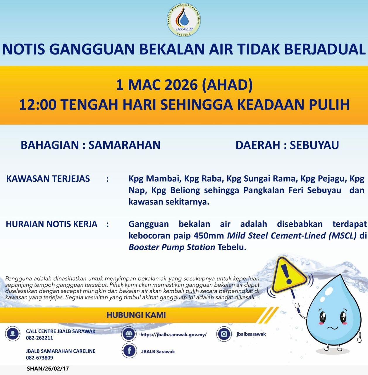 Unscheduled Water Interruption Notice at Samarahan (Sebuyau) (03.03.2026)