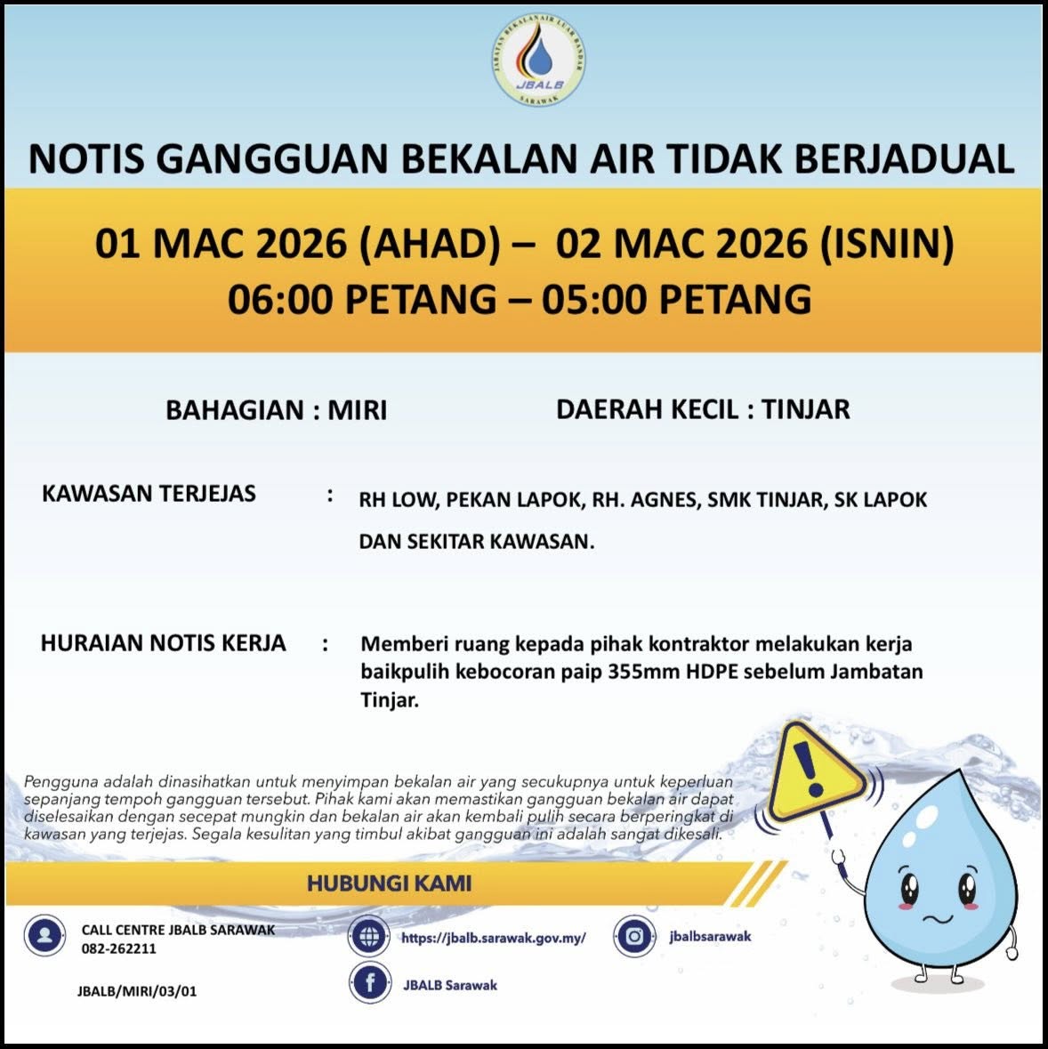 Unscheduled Water Interruption Notice at Miri (Tinjar) (01-02.03.2026)