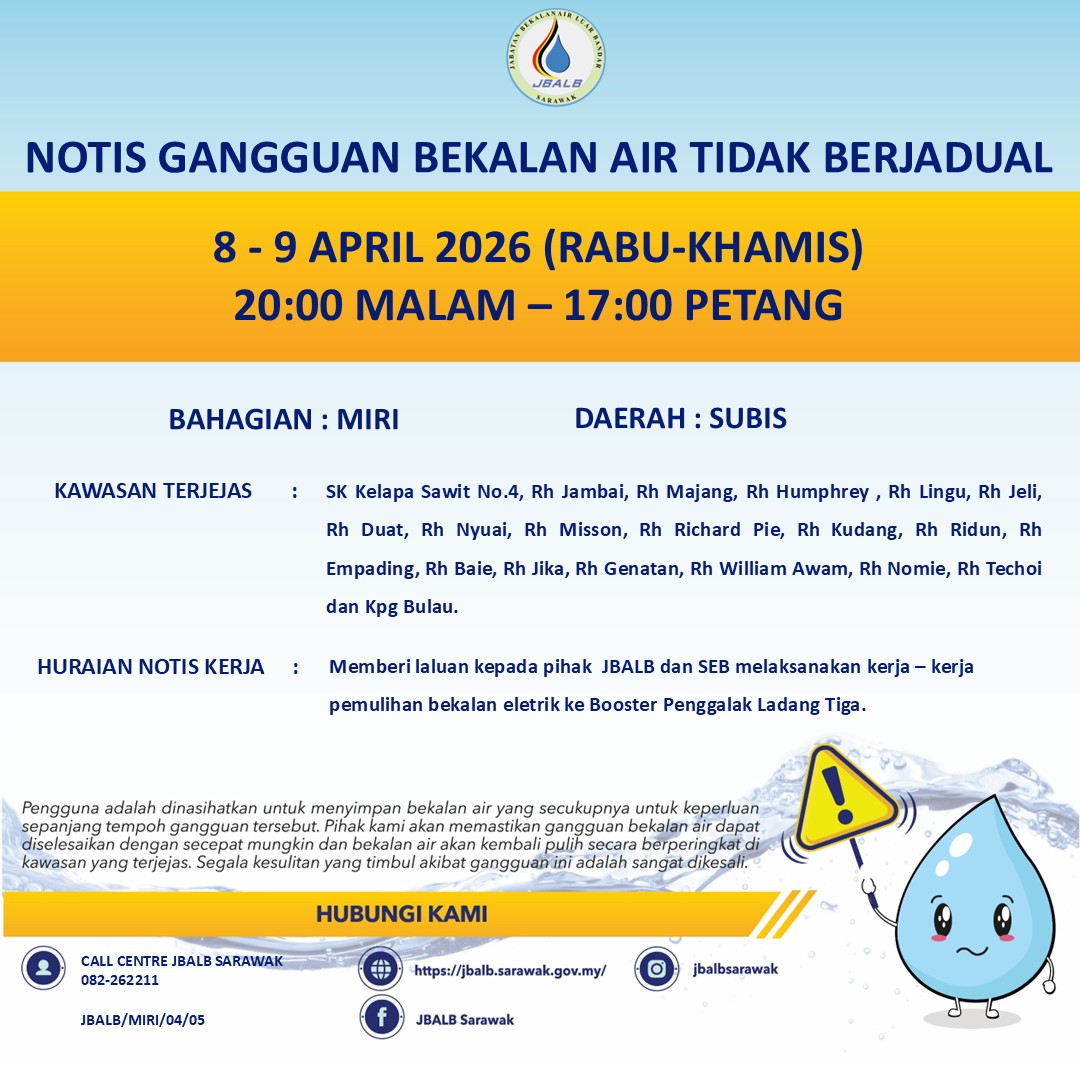 Unscheduled Water Interruption Notice at Miri (Subis) (08-09.04.2026)