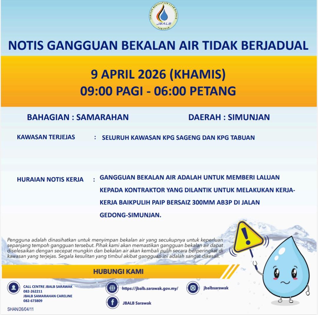 Unscheduled Water Interruption Notice at Samarahan (Simunjan) (09.04.2026)