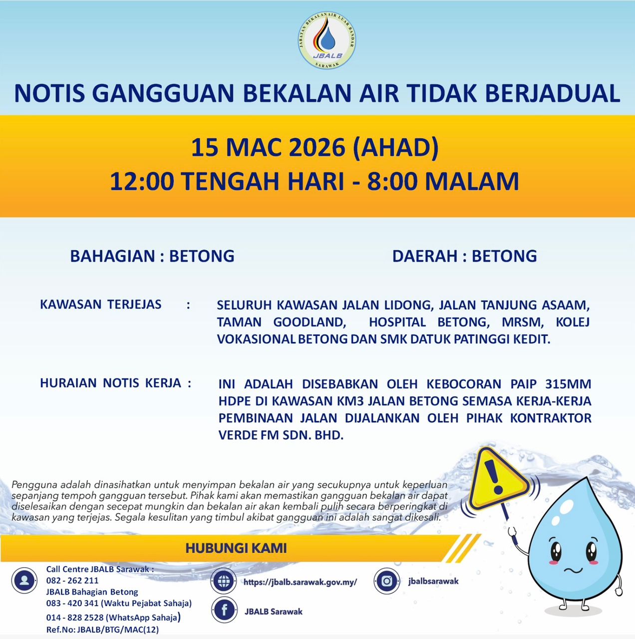 Unscheduled Water Interruption Notice at Betong (15.03.2026)