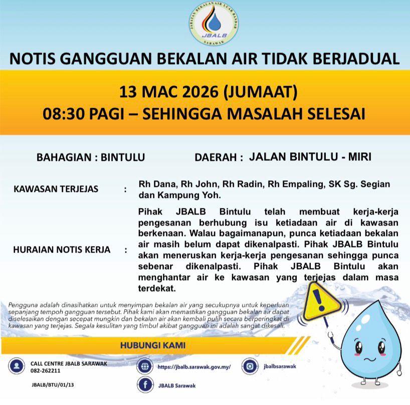 Unscheduled Water Interruption Notice at Bintulu (Jalan Bintulu-Miri) (13.03.2026)