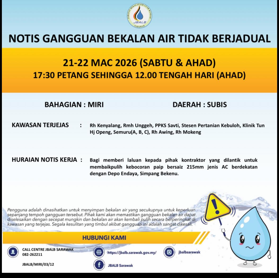 Unscheduled Water Interruption Notice at Miri (Subis) (21-22.03.2026)