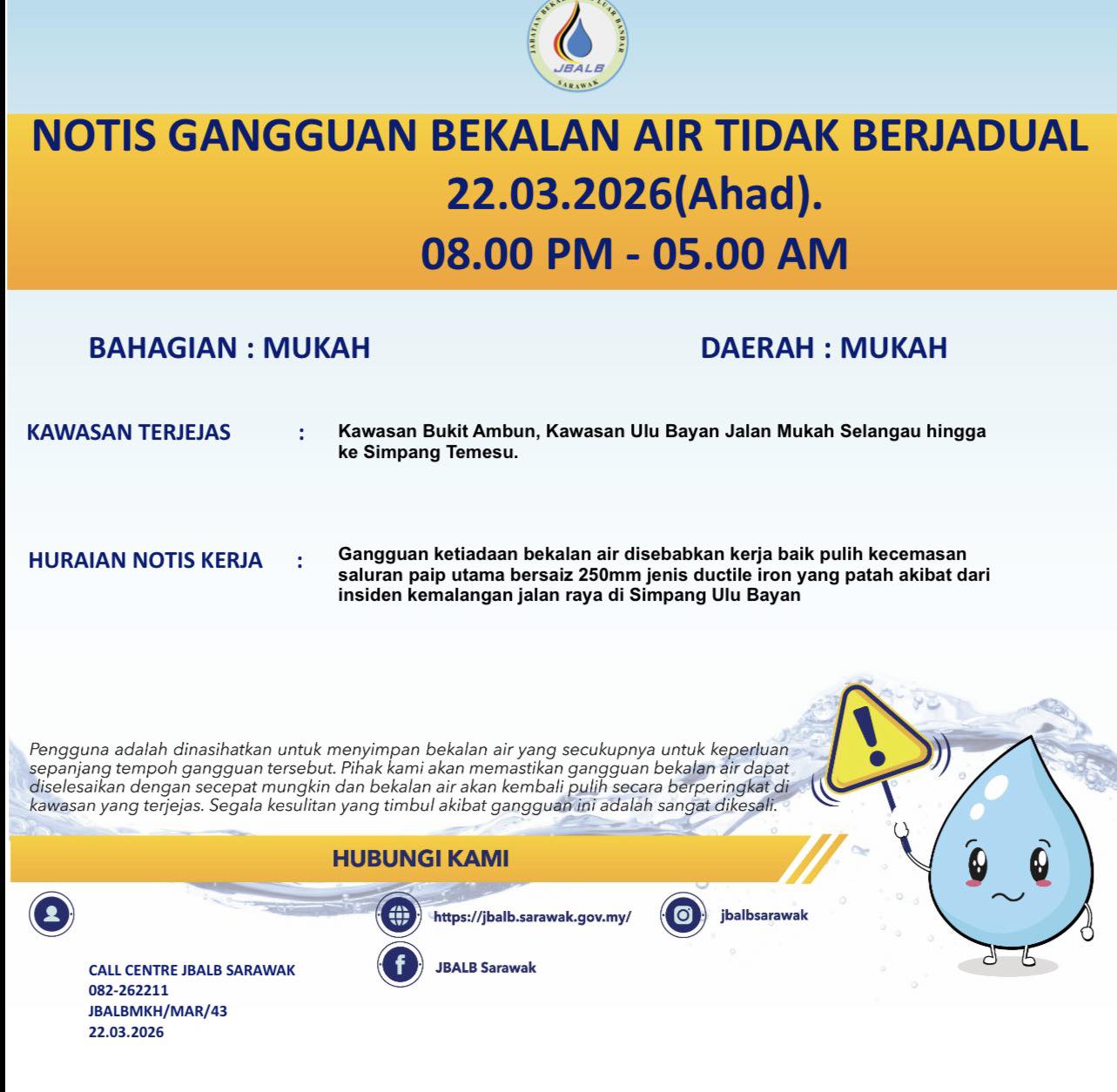 Unscheduled Water Interruption Notice at Mukah (22.03.2026)