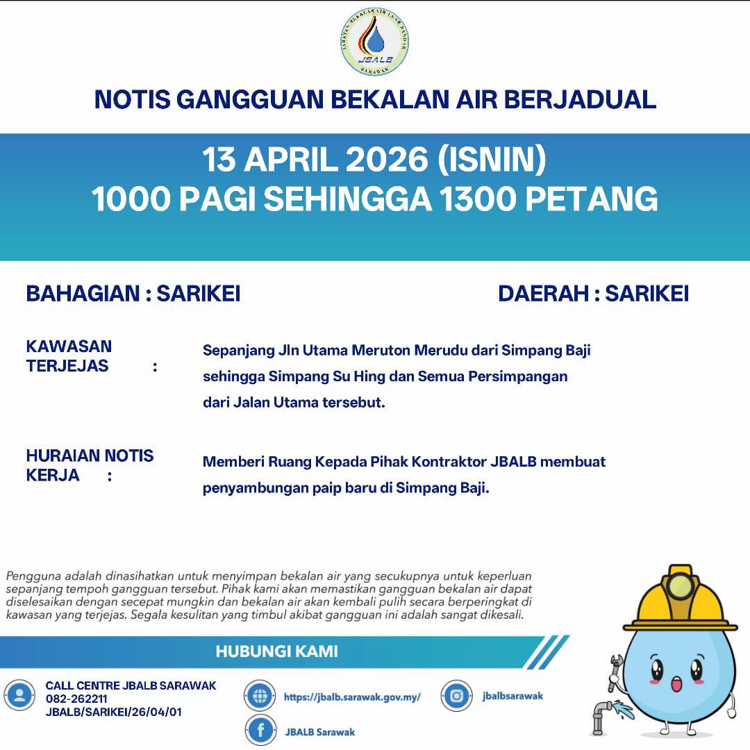 Scheduled Water Interruption Notice at Sarikei (13.04.2026)