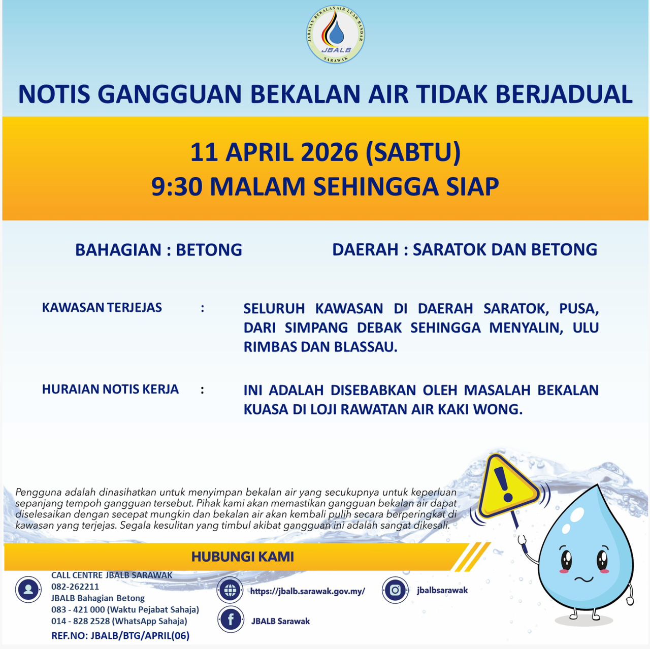 Unscheduled Water Interruption Notice at Betong (Saratok & Kabong) (11.04.2026)
