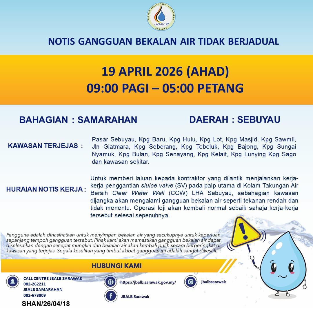 Unscheduled Water Interruption Notice at Samarahan (Sebuyau) (19.04.2026)