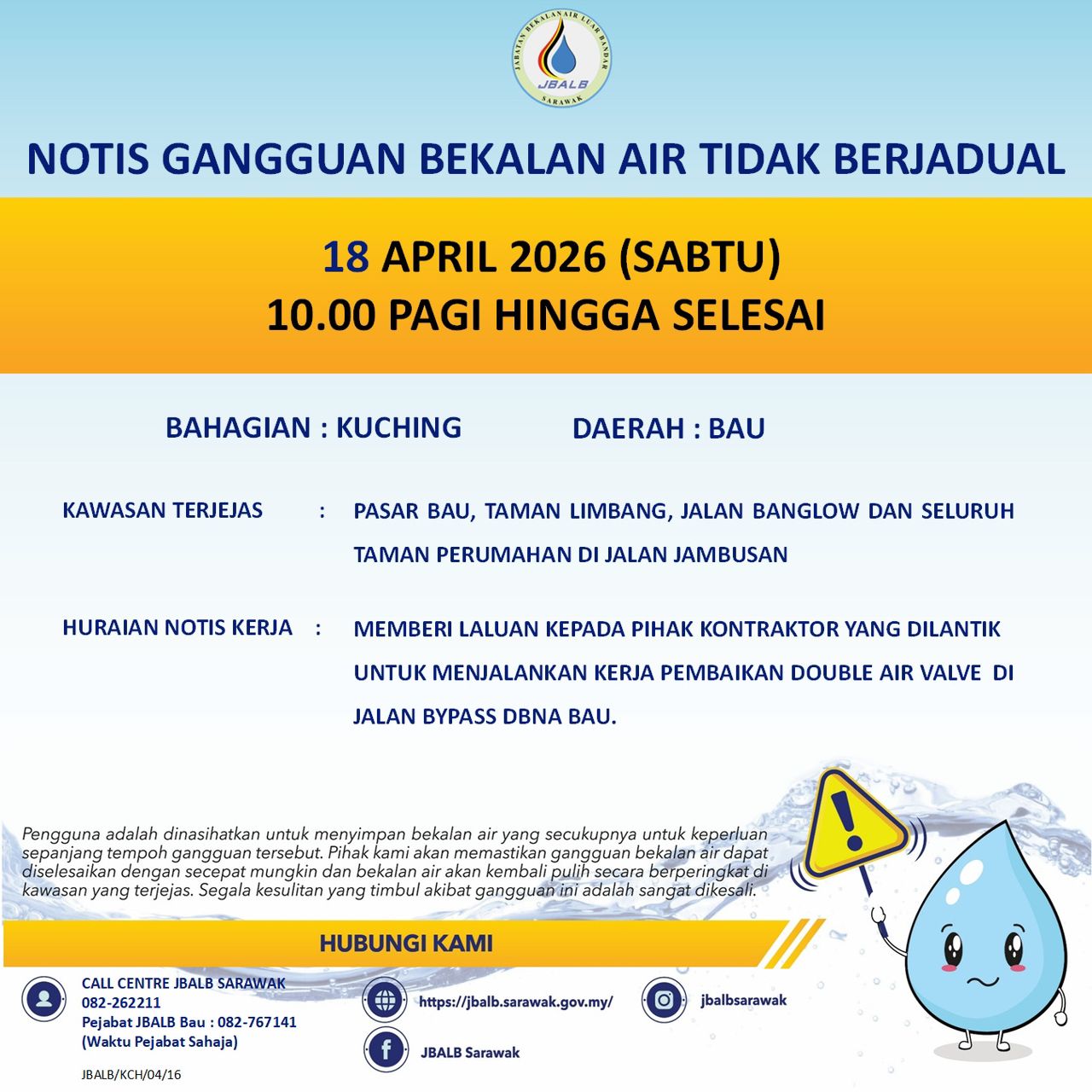 Unscheduled Water Interruption Notice at Kuching (Bau) (18.04.2026)