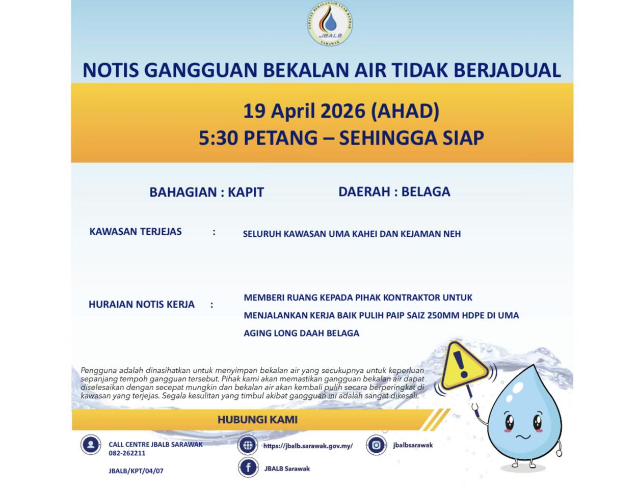 Unscheduled Water Interruption Notice at Kapit (Belaga) (19.04.2026)