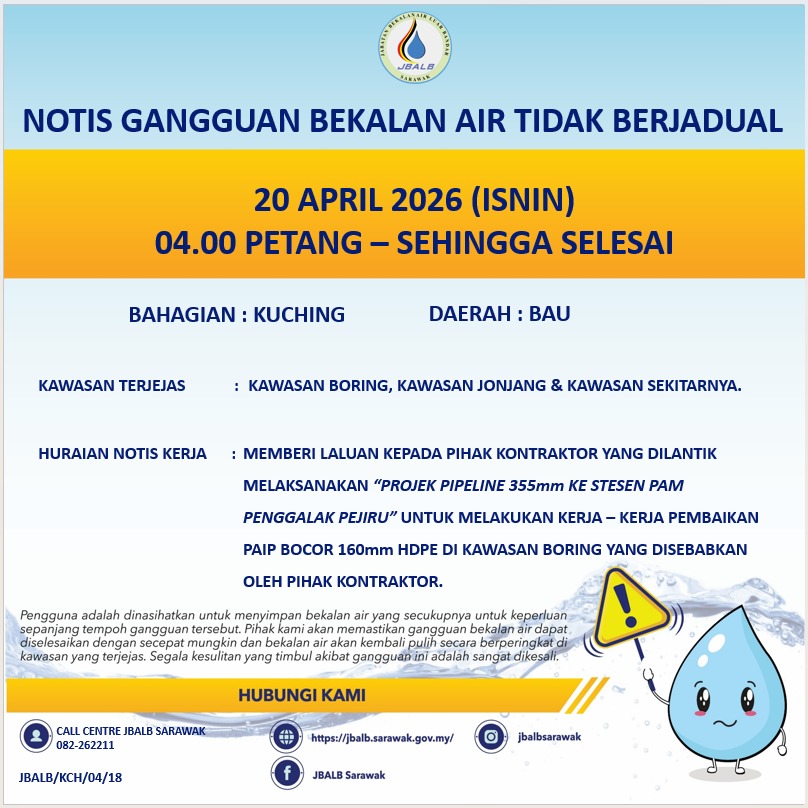 Unscheduled Water Interruption Notice at Kuching (Bau) (20.04.2026)