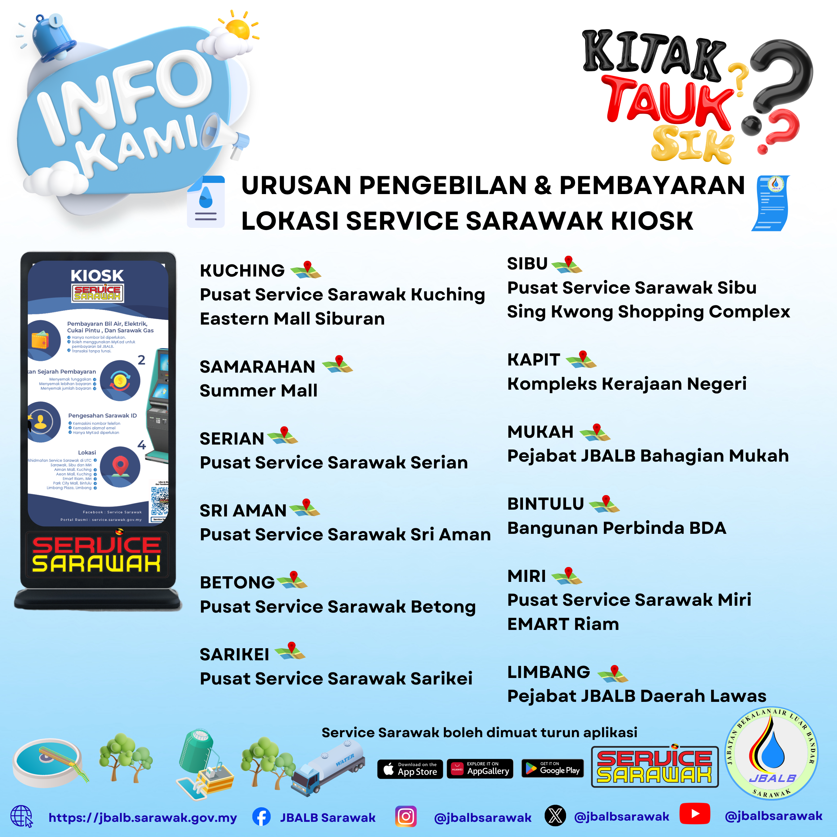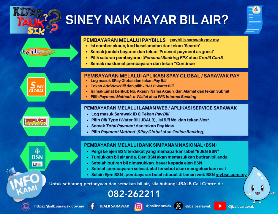 Service Sarawak app is not limited to bill payment but also to other online services as mentioned in infographics.Besides this app, JBALB water billing payment can be done using S PAY GLOBAL app and Paybills website.