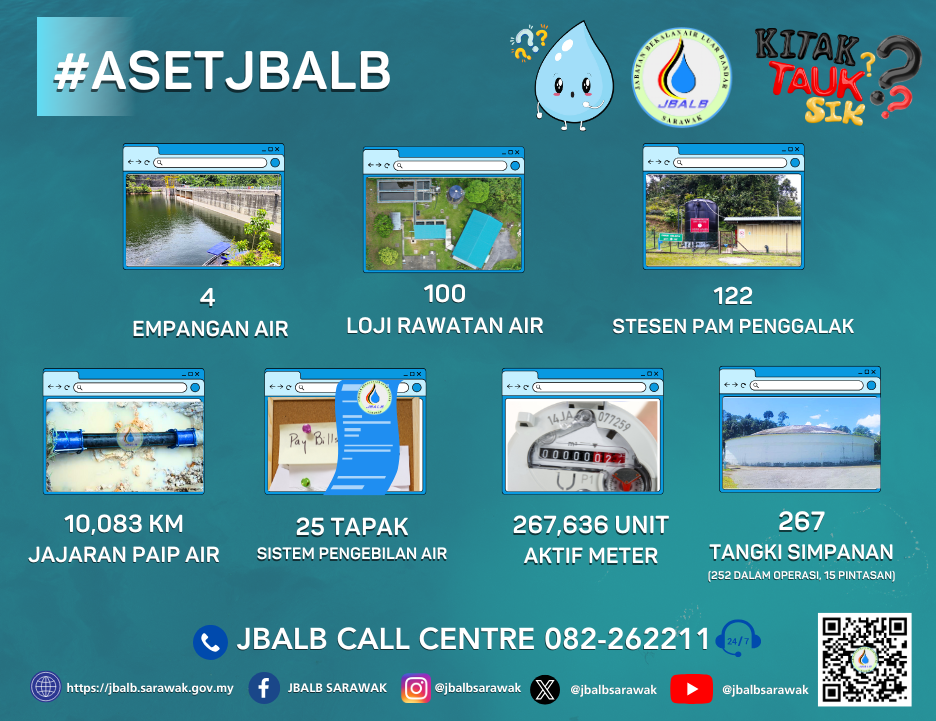 Currently, JBALB is operating and maintaining 100 water treatment plants (WTP), 122 booster pumping stations (BPS), 267 storage water tanks and 10,073km of water pipeline in the whole of Sarawak with a design capacity to supply 656.305 million liters a day (MLD) with current production of 589.272 million liters a day (MLD) to meet the demands of approximately 1.12 million users.