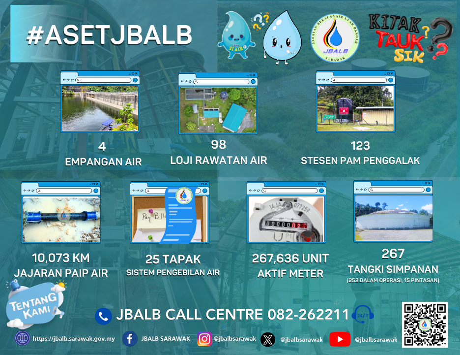 Currently, JBALB is operating and maintaining 98 water treatment plants (WTP), 123 booster pumping stations (BPS), 267 storage water tanks and 10,073km of water pipeline in the whole of Sarawak with a design capacity to supply 656.305 million liters a day (MLD) with current production of 589.272 million liters a day (MLD) to meet the demands of approximately 1.12 million users.