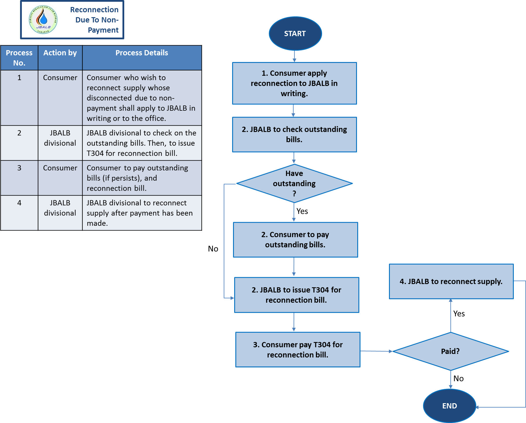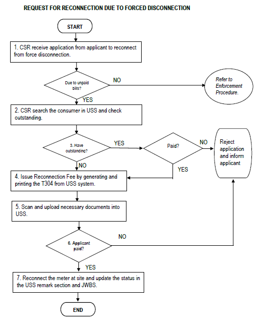 Consumers who wish to reconnect supply after being disconnected due to non-payment shall proceed to apply at any Service Sarawak counters through digital channels (Sarawak Government website / Service Sarawak website/mobile application) for reconnection. The procedure is as follows: