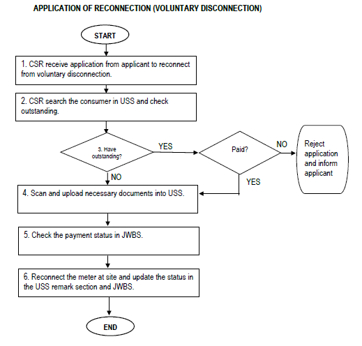 Application for reconnection shall apply to all disconnection works where the disconnection was voluntary applied by the applicant as per procedure 'Application of Disconnection (Permanent)' and 'Application of Disconnection (Temporary)'. It shall not be applicable to 'Reconnection - due to forced disconnection'.