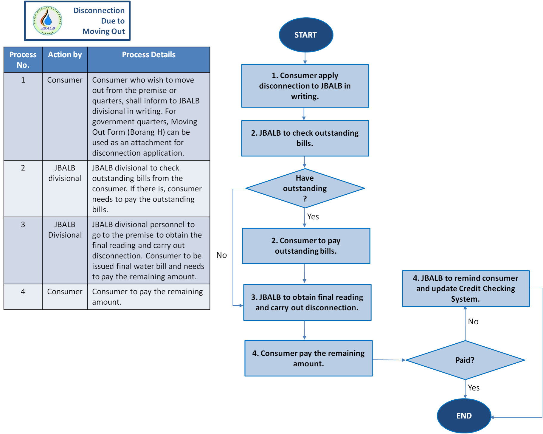 Failure to pay the remaining balance as appeared in final water bill, JBALB shall update consumers particulars of non-payment in Credit Checking System (CCS), which will be shared with other water utility agencies, causing consumers will not be able to apply for new connection.