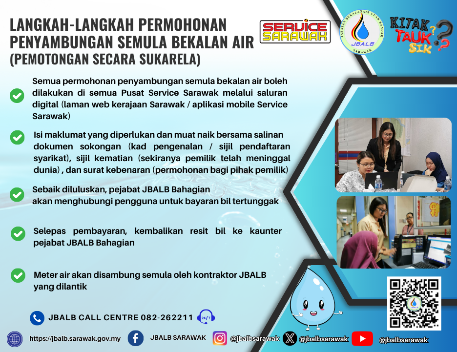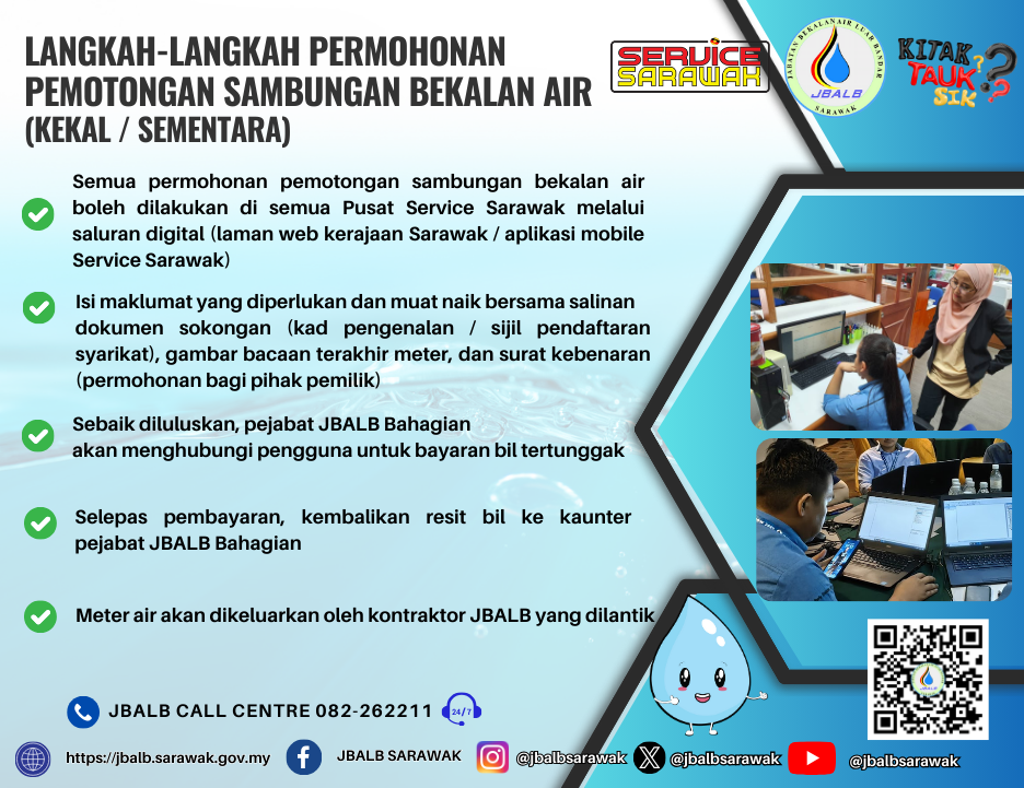 In case of consumers who wish to disconnect due to moving out from premise or government quarters, application can do so at any Service Sarawak counters through digital channels (Sarawak Government website / Service Sarawak website/mobile application) the following procedures can be used: