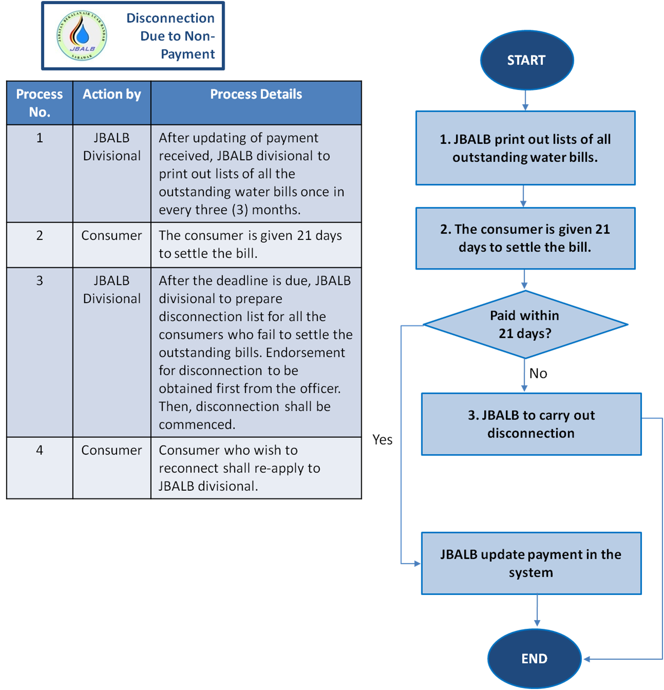 When customer has not settled their bill for the past 2 billing months, JBALB shall carry out disconnection procedures due to non-payment.