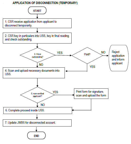 Application for temporary disconnection shall apply to all temporary disconnection can do so at any Service Sarawak counters through digital channels (Sarawak Government website / Service Sarawak website/mobile application) whereby the applicant wishes to temporarily terminate and intend to occupy the premise again sometime in future