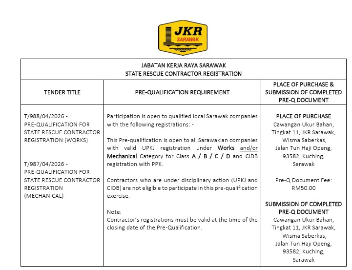Tender Terbuka Pra-Kelayakan bagi Projek Program Non-Revenue Water (NRW) Nasional Pendekatan 1 Fasa 2 (Reka & Bina) - Negeri Sarawak telah mula diiklankan di Myprocurement melalui pautan: https://myprocurement.treasury.gov.my/advertisements/tender/6f28ecaea3b41f5554d114dbfe208902 bermula 23 Februari 2026 (Isnin). Tarikh tutup tender adalah pada 26 Mac 2026 (Khamis).